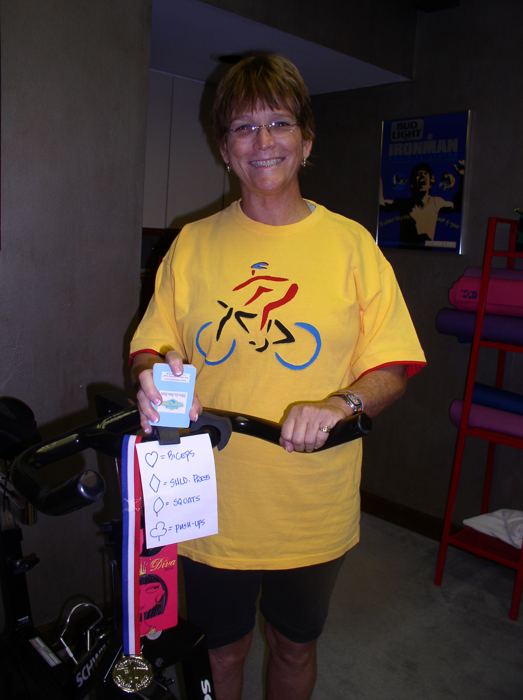 A good time was had by all this morning at Bud’s Ultimate Fitness, Inc.  We had a spinning class complete with Christmas music and elf hats.  After spinning, Bud lead us through an intense upper body workout.  We went though a whole deck of cards–meaning that each time she drew a card we had to do that number of reps, depending on which suit it was. The four exercises were bicep curls, squats, shoulder presses and push ups.  For example, a 10 of spades was ten bicep curls.  All face cards equaled 10 reps. Bud always keeps workouts interesting!OLYMPUS DIGITAL CAMERA