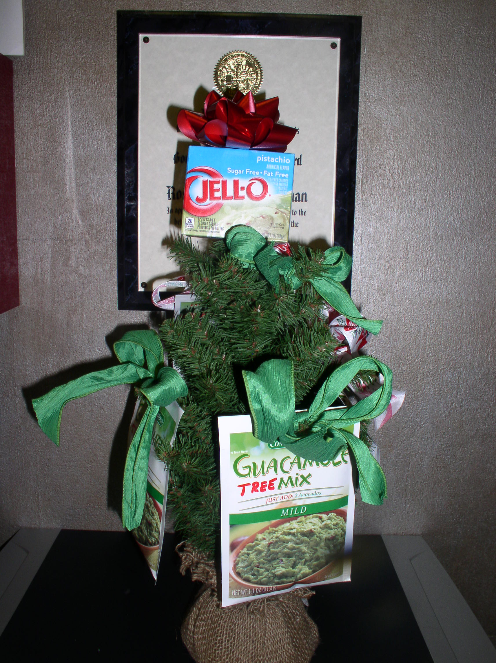 OLYMPUS DIGITAL CAMERABud Seaman, owner of Ultimate Fitness, has a good sense of humor, so for Christmas, her clients serenaded her with their own rendition of “The Twelve Days of Christmas.”  It didn’t include a partridge in a pear tree, but a guacamole tree!  Believe it or not, Bud thought that guacamole came from the fruit of a guacamole tree.  So, here is our version of a guacamole tree.